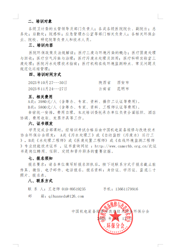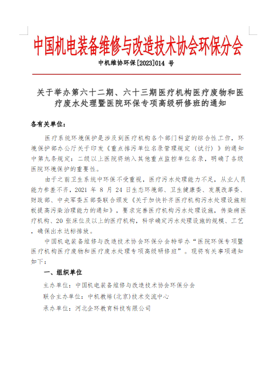 第六十二、六十三期 醫(yī)療機構(gòu)醫(yī)療廢物和醫(yī)療廢水處理高級研修班